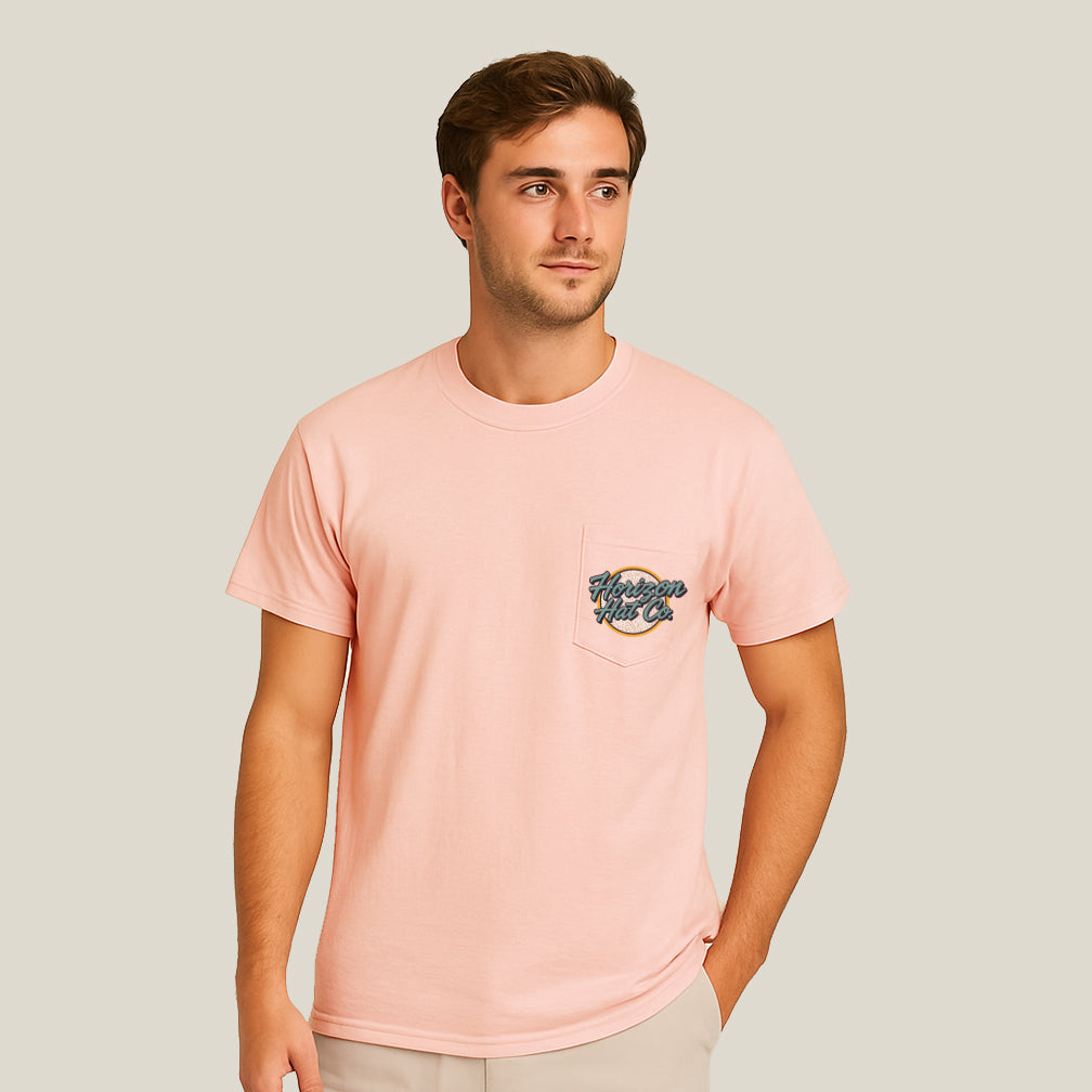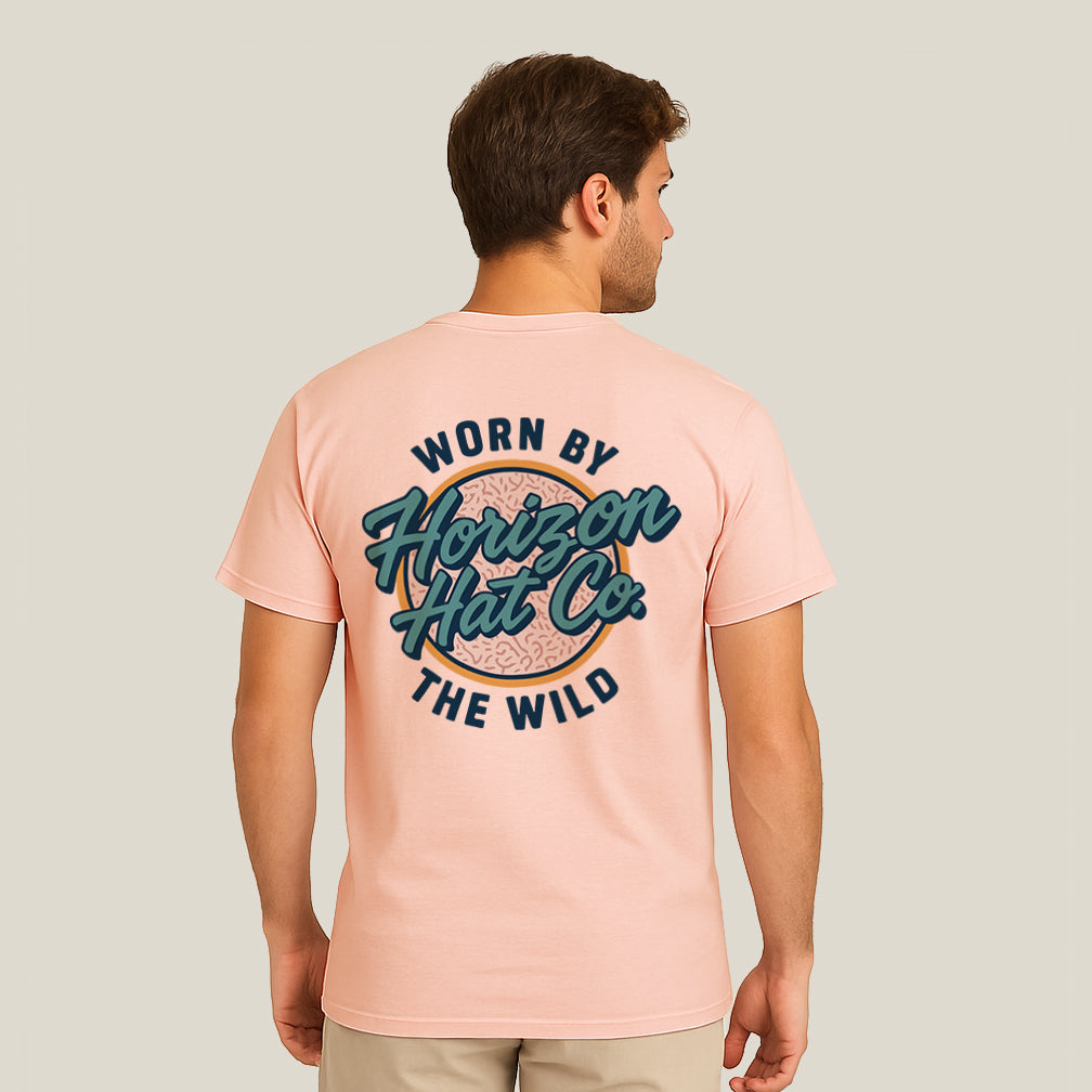 Worn by the wild. This Horizon Hat Co. tee features a bold retro-style logo on the back, with 2 design options printed on a Comfort Colors 6030 pocket t-shirt that’s soft, durable, and effortlessly cool.