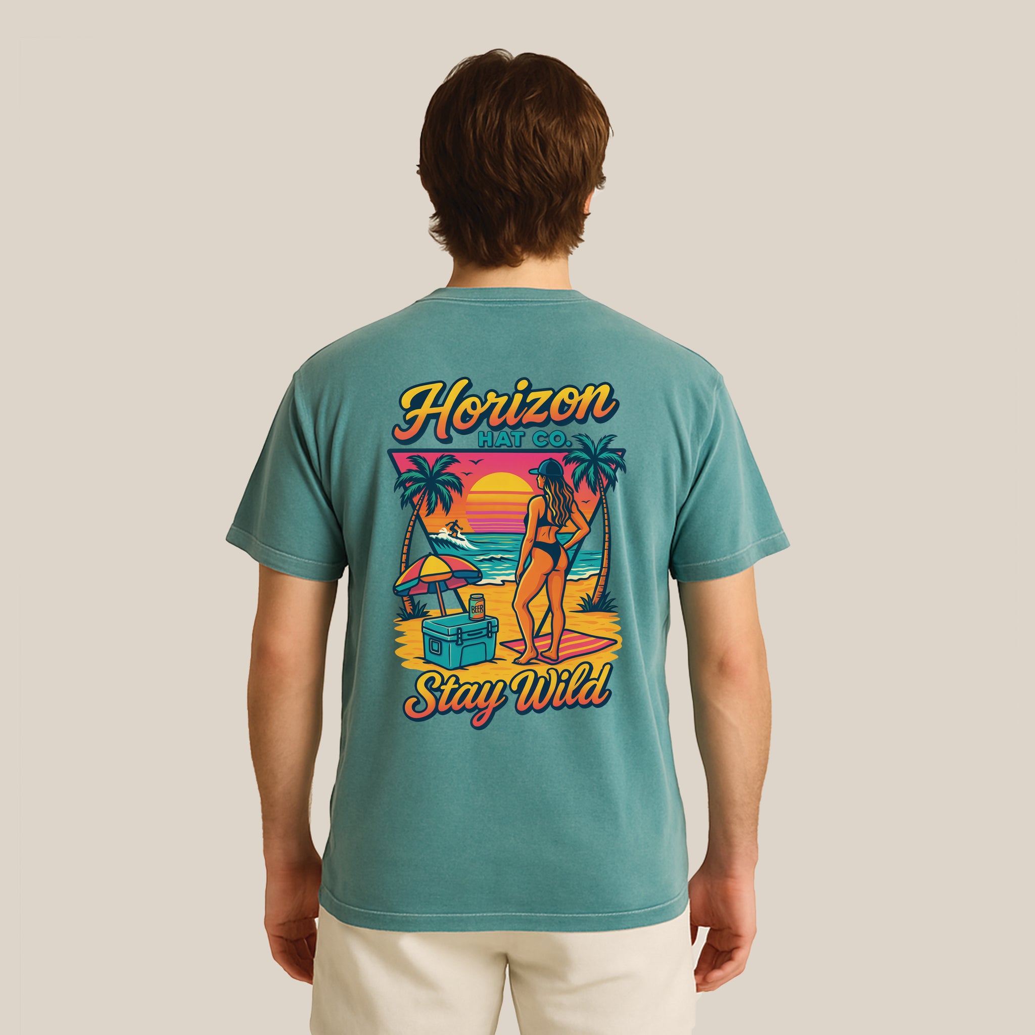 Life’s a beach, so Stay Wild. This Horizon Hat Co. tee brings the heat with a bold, sunset-soaked design printed on a Seafoam Comfort Colors 6030 pocket tee. Ultra-soft, relaxed, and ready for anything.